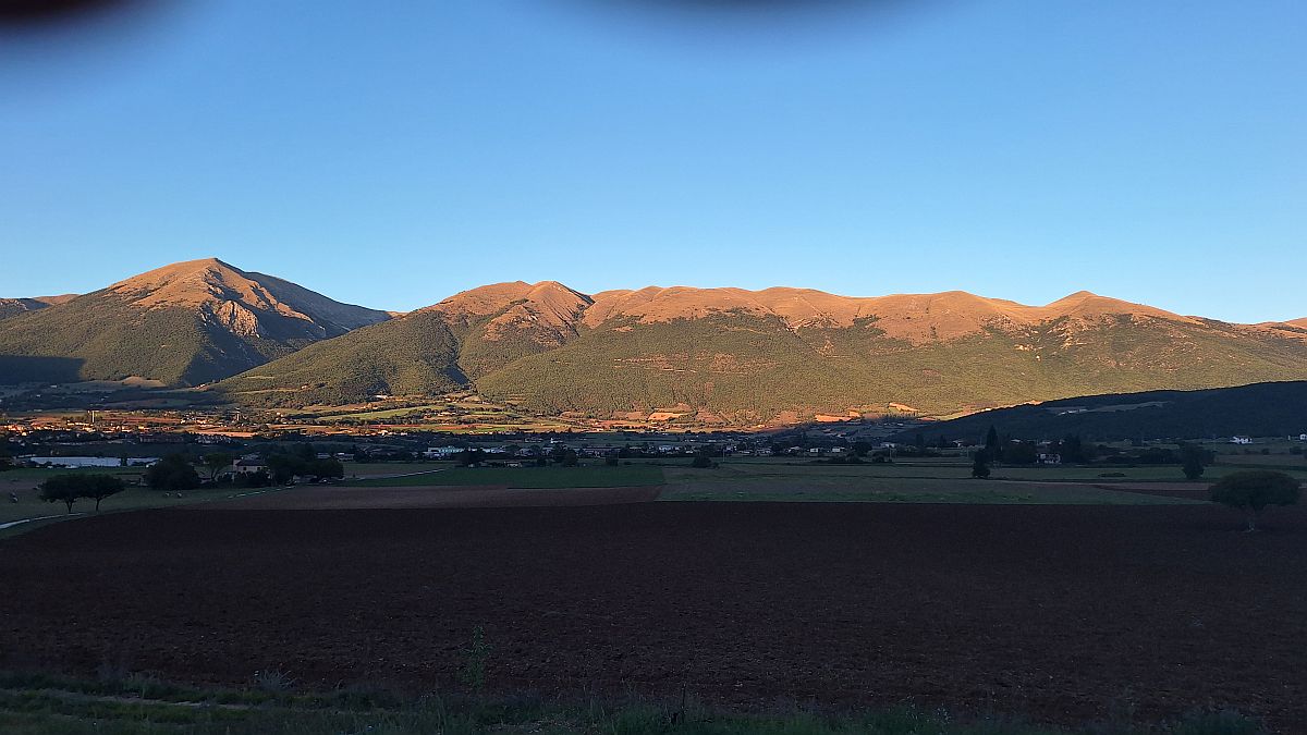 Zurück am Haus, der Schotterweg hat uns nicht abgeworfen, ziehen wir uns um und gehen mit dem Einkauf hinter das Haus. Die Sonne will langsam untergehen, die Bergkulisse und das Lichtspiel sind schon beeindruckend.