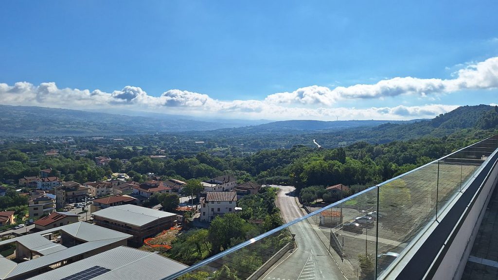 Unter uns sehen wir die kleinen Ortschaften, teilweise sind an Gebäuden Kräne zu sehen. Von hinten kommt eine Erklärung: Die bleiben so lange stehen, bis alle Häuser renoviert sind. Eine Erklärung, die mir gut gefällt.