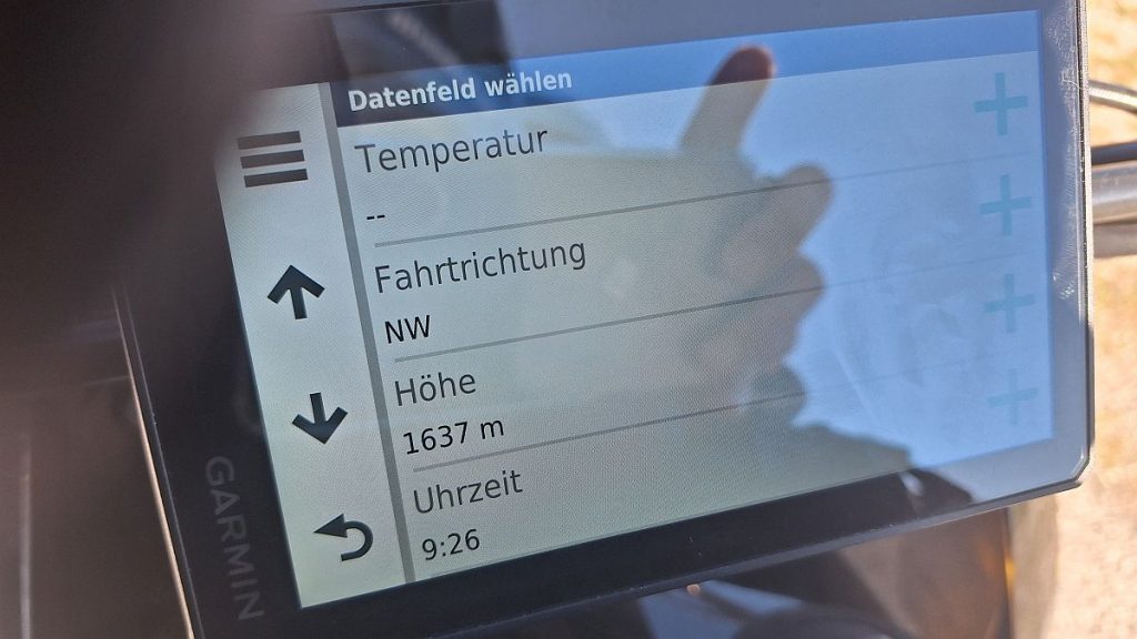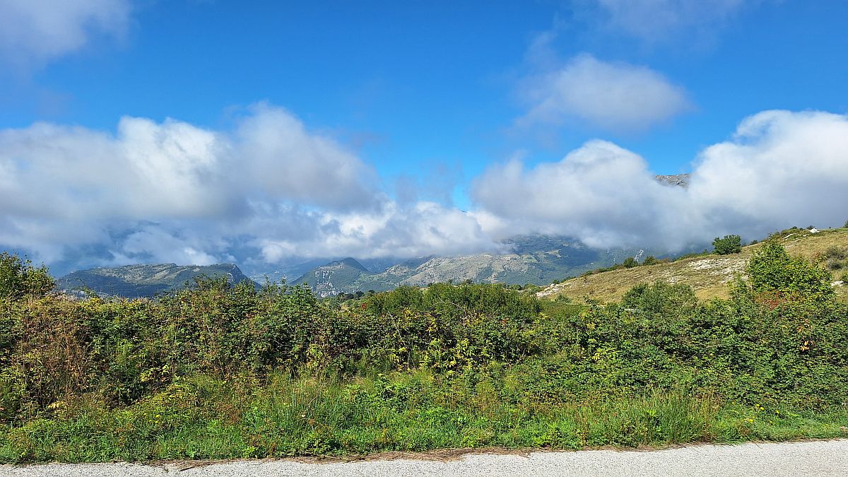 Höher und höher geht die Straße und die Aussicht, unterstützt durch den blauen Himmel, muss mit einem spontanen Bild während der Fahrt belohnt werden. Wer genau auf den Tacho schaut, kann unser Wandertempo erahnen.