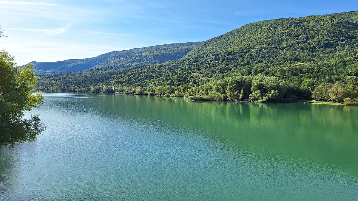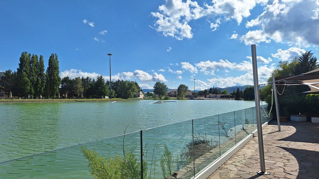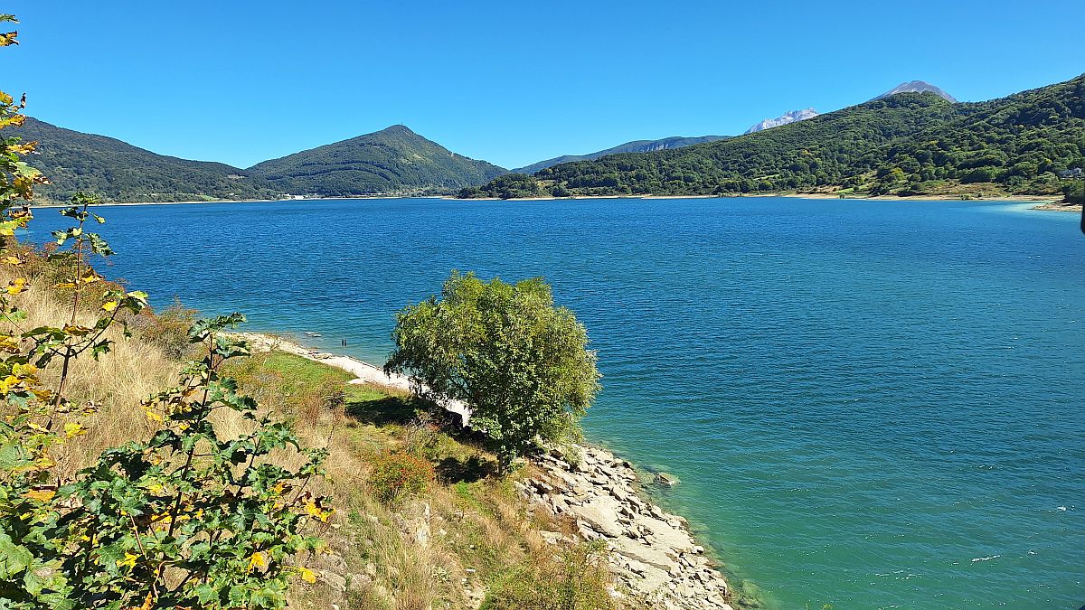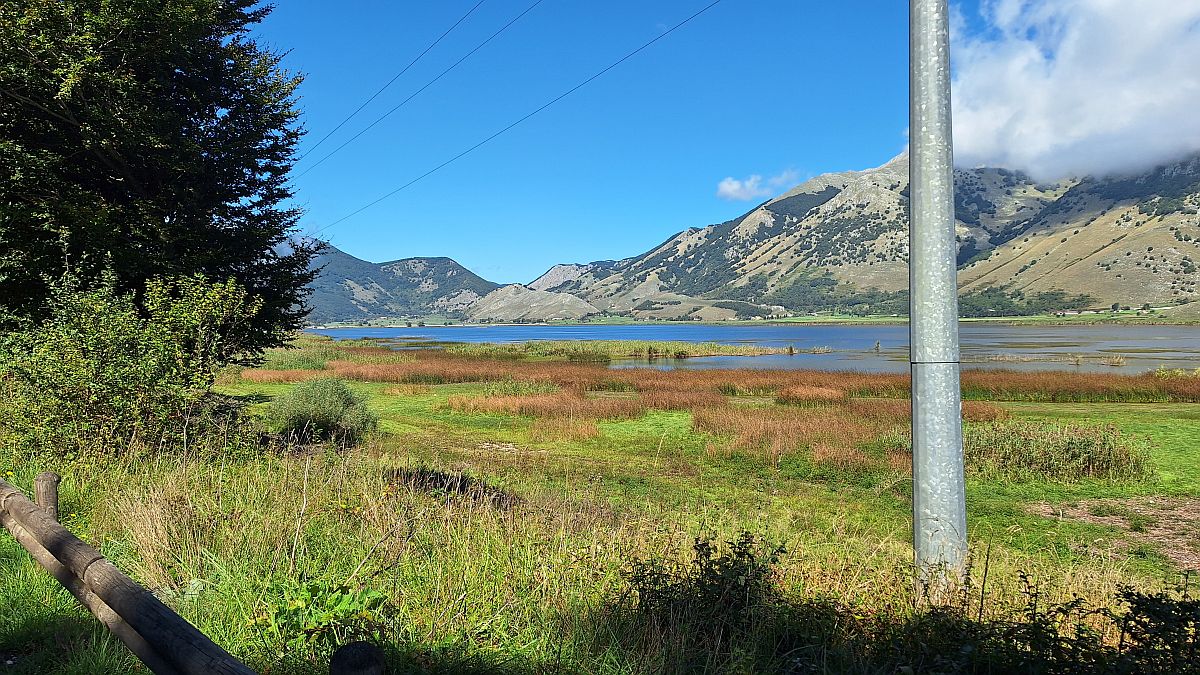 Aus der Stadt geht es erst nochmal den Weg zurück nach Süden über die SS17 und SS83, auf denen wir gestern gekommen sind. Es geht wieder bergauf und der Wald begleitet uns. Nach einer Anhöhe geht es wieder hinunter – und wir können es kaum glauben: Ein See, diesmal mit richtig viel Wasser empfängt uns.