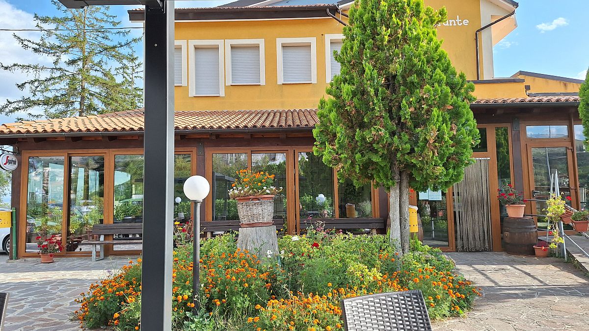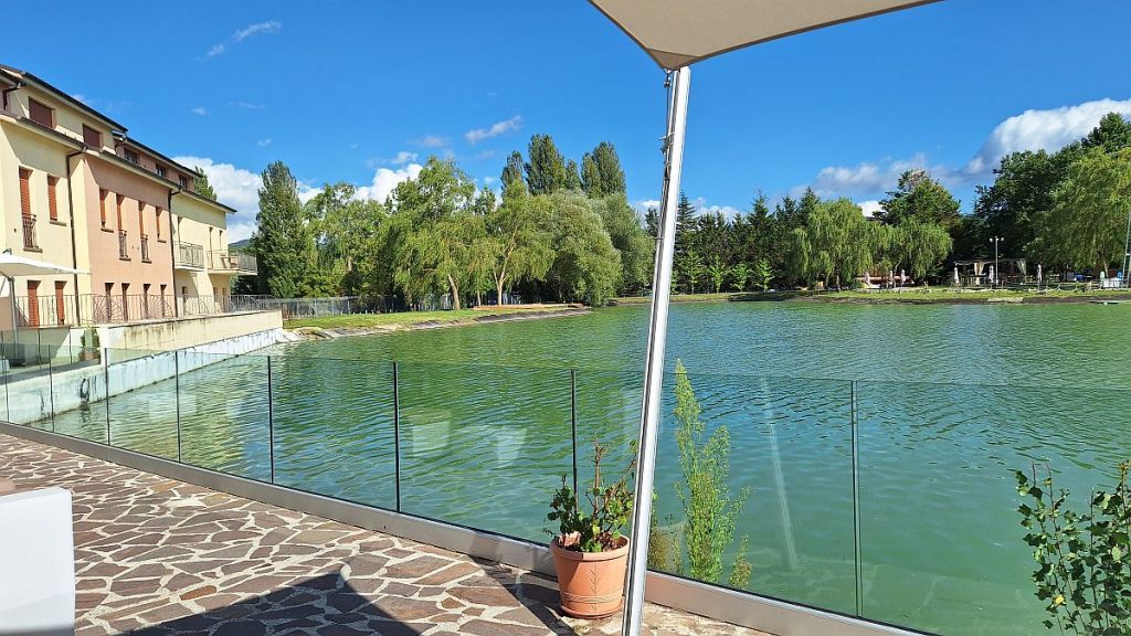 Heutiges Ziel nach 170 Kilometern ist Castel Sangro. Ich hatte beim planen schon schwer darauf geachtet, die richtige Einfahrt zu programmieren und fuhr dem Navi entlang. Eigentlich sollte ein See sichtbar sein, wir aber befinden uns auf einer Straße im Industriegebiet. Isabella meint, vielleicht liegt es ja hinter dem Zaun, meiner damaligen Erkundung müsste sich das Hotel aber auf der anderen Seite befinden. Wir geben die Adresse nochmal mit der höchsten Hausnummer ein, denn die angegebene Nummer kennt das Navi nicht. Kaum fahren wir los, kommen wir an der Einfahrt zum Hotel an. Obwohl ich es im Navi, wie sich später herausstellt, richtig eingetragen hatte, meinte es eine eigene Interpretation umsetzten zu wollen. Und meine Frau hatte natürlich Recht, hinter dem Zaun war sowohl der leider nicht einsehbare See und das Hotel.