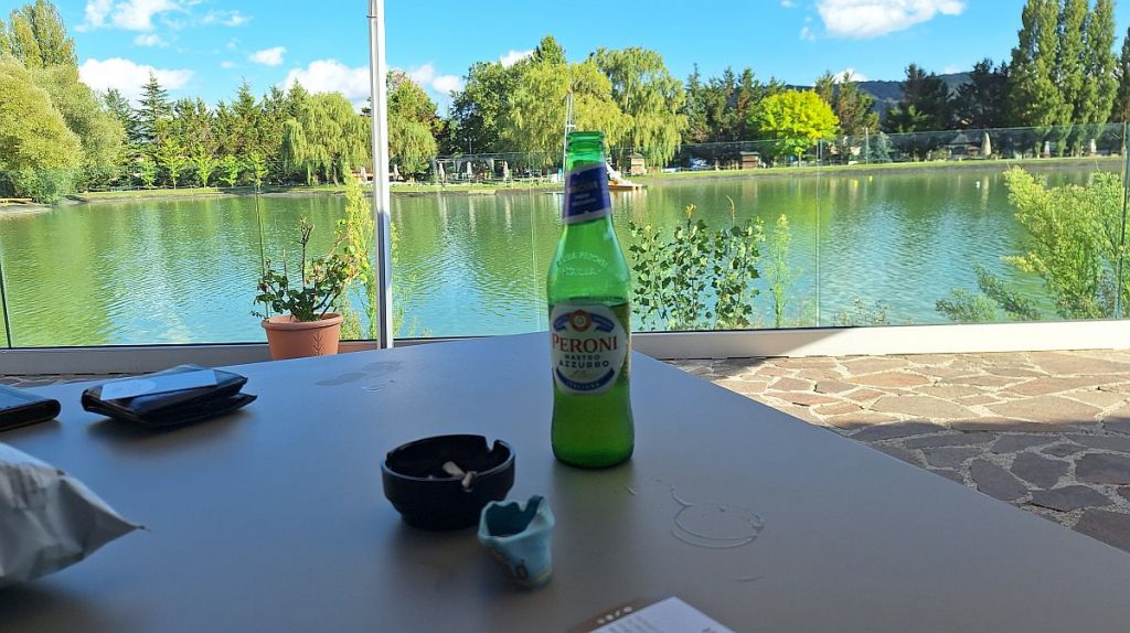Einchecken, Zimmer in Beschlag nehmen und das Gepäck abladen. Tankrucksack leeren, den nehmen wir für die nächste kleine Fahrt mit, denn diese Unterkunft bietet nur Frühstück. Wieder den Schotterweg zurück und ab in die Ortschaft. Schnell noch tanken, der Automat nimmt aber nur einen 20 Euroschein. Gut, reicht für 200 weiter Kilometer. Der Supermarkt ist schnell gefunden und das Notwendigste für den Abend ist eingekauft: Brot, Wein und Schinken. Isabella macht noch einen Vorschlag und wir gehen in einer Bar noch ein Bier trinken. Es wird das einzige Bier sein, dass wir während einer Fahrt zu uns nehmen.