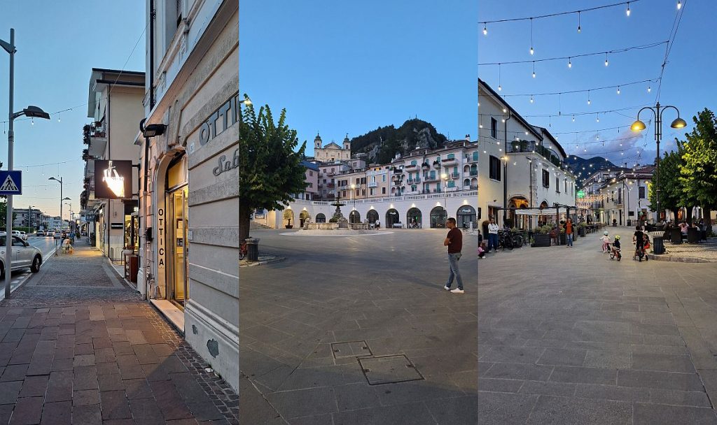 Auf einem Platz tobt der Bär, viele kleine Kinder sind unterwegs, obwohl es schon fast 8 Uhr ist. Nicht ganz schlüssig fallen wir in einer Bar, eigentlich soll es ein Caffe sein, ein.  Da wir essen wollen, wird uns ein Platz zugewiesen. Auf der Karte finden wir typisch italienische Kost und bestellen uns zwei Cheeseburger mit Cola. Nein, natürlich nicht, wir bestellen einen Mezzo Litro di Rosso, d.h. Wein zum Burger. Wir sind ja keine Banausen. Mit ein paar Pommes vorab kommen wir auf den grotesken Betrag von 20 Euro.