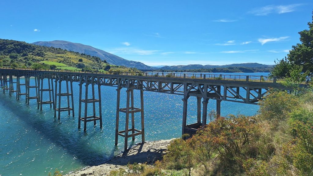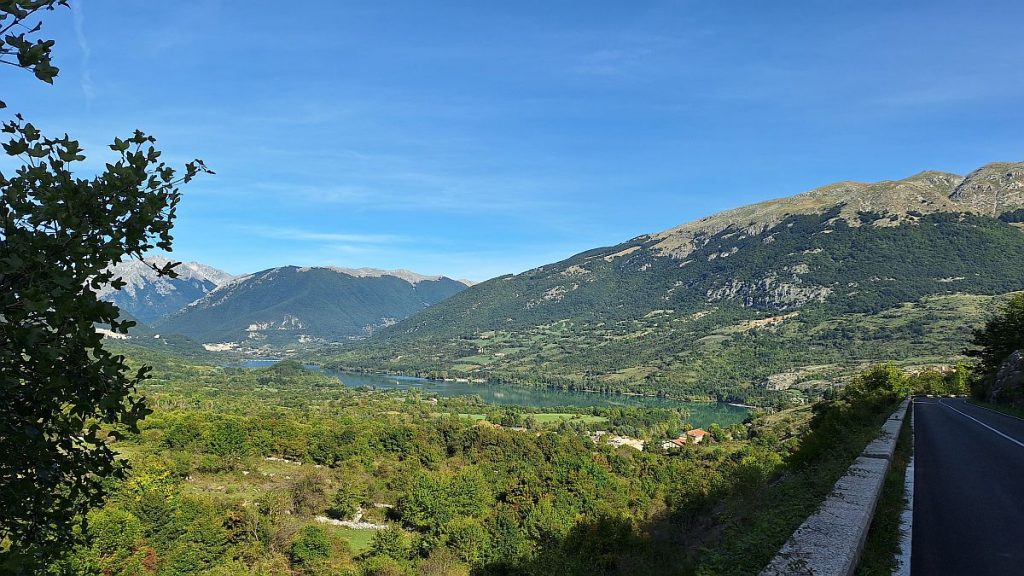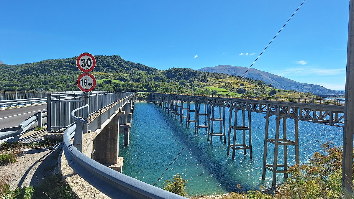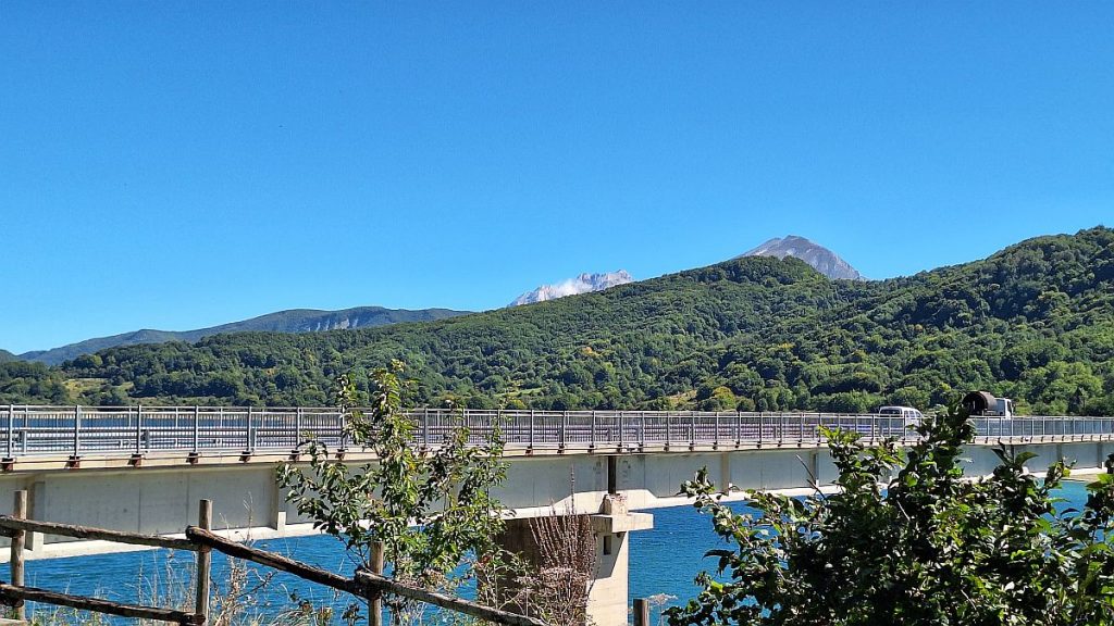 Nach der Stärkung geht es zurück, wieder an den drei Baustellenampeln vorbei, die uns schon auf dem Hinweg ausgebremst haben. Wieder in Richtung Norden der SR577 entlang kommen wir an einen großen See Lago di Campotosto, über den eine lange Brücke geht. Eigentlich sind es zwei, eine alte, die nicht mehr in Benutzung ist und eine neue, über die wir hinüberfahren.