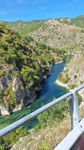 Dann steht da schon wieder so ein „Durchfahrt verboten“ Schild, und die Straße danach sieht auch danach aus, d.h. viel Grün auf dem Weg. Genug der Experimente, wir fahren etwas gefrustet zurück auf den Hauptweg. Von dort aus weiter auf der SS80 suchen wir eine Bar und werden nach ein paar Kilometern fündig. Mit Mineralwasser und einem Panini ausgestattet sitzen wir vor der Bar im Schatten und stillen unseren Hunger. Links und rechts die Berge, die Straße verläuft einer Schlucht entlang.