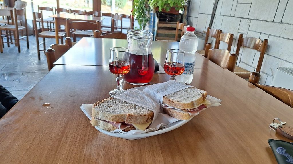 Nach 210 Kilometern kommen wir gegen halb vier an. Beim einchecken sehen wir, dass die Küche um 4 Uhr schließt. Die Frage nach etwas Essen wird verneint, aber ein Panini kann man uns noch machen. Passt wunderbar, dazu eine Karaffe Rosé. Diesmal ziehen wir uns nicht um, sondern genießen Speis und Trank. Was für Brote: