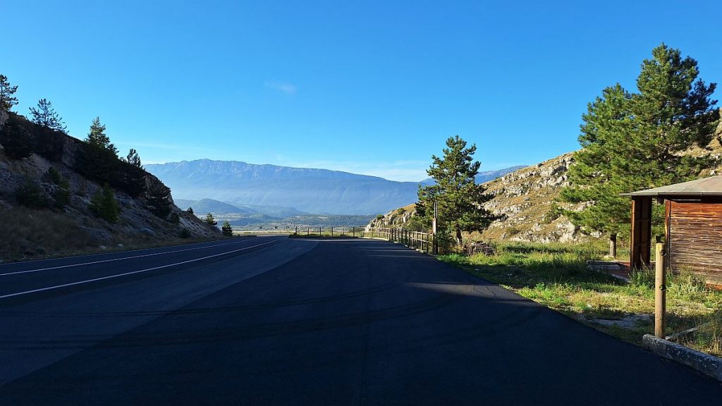 Nach dem nächsten Ort versperrt eine Schranke den Weg, aber wohl nur im Winter, denn sie ist geöffnet. Jetzt geht es richtig bergauf, teilweise mit 15% Steigung. Und wir sind ganz alleine auf der Strecke unterwegs, was wir sehr genießen. Der Motor müht sich redlich, aber schnell wollen wir eh nicht unterwegs sein. Kurve um Kurve verändert sich die Sicht auf die Berge, welche teilweise oberhalb der Baumgrenze liegen müssen. Das morgendliche Licht lässt die Umgebung weich erscheinen, was mit dem knallblauen Himmel einen schönen Kontrast abgibt.