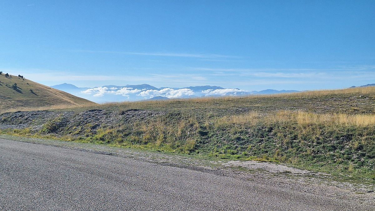 Navi neu starten und schon ist es auch meiner Meinung, die Schotterstrecke links liegen zu lassen. Immer der Via Roma entlang, eine Straßennummer kann ich nicht erkennen. Egal, die Aussicht ist super, wir fahren wieder über den Wolken. Und die Auswahl der warmen Klamotten hat sich gelohnt.