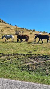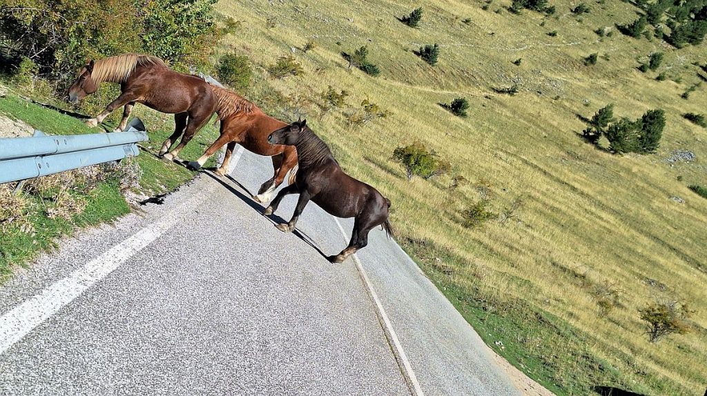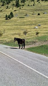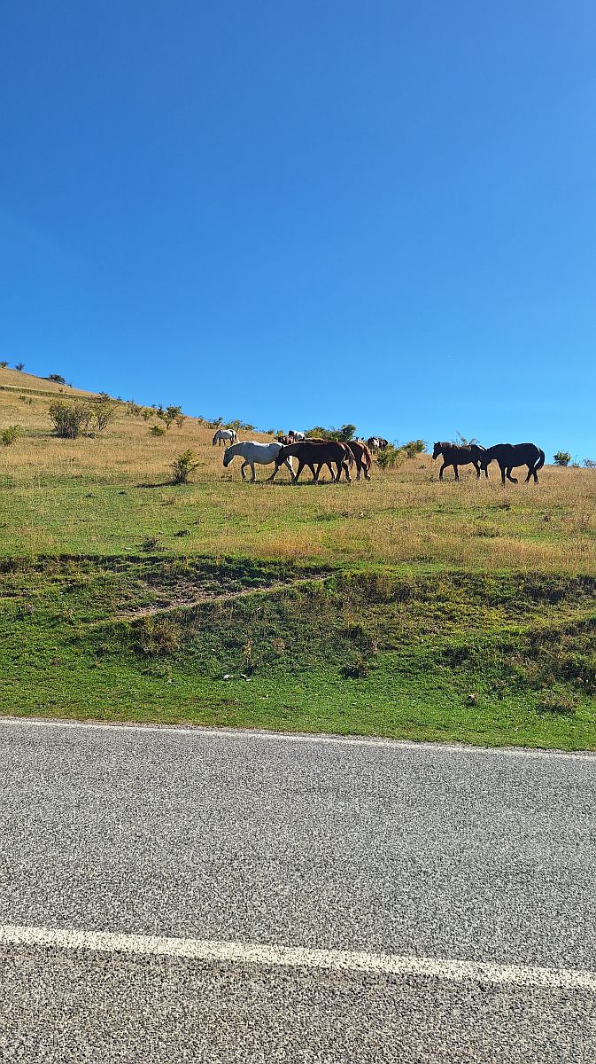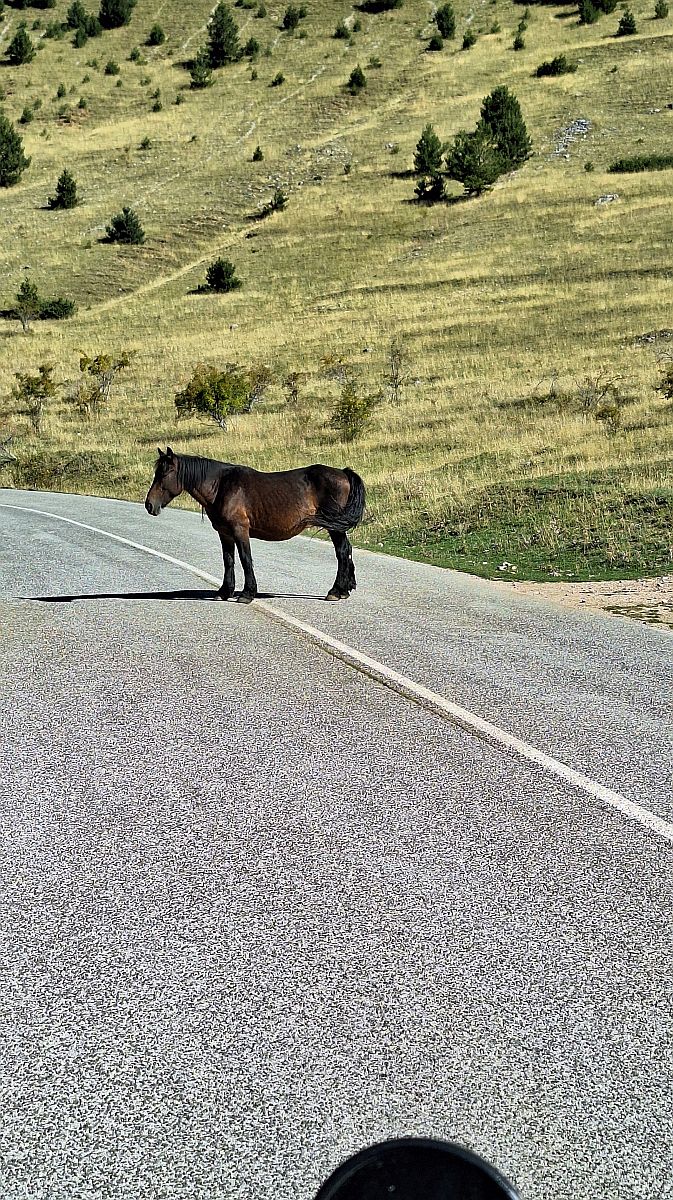 Ein Pferd geht auf die Straße und bleibt stehen. Es sieht so aus, als ob damit der Weg gesperrt werden soll. Es folgen weitere Pferde, die die Straße überqueren. Uns immer im Blick, entweder aus Neugier oder um zu sehen, ob wir etwas unternehmen.