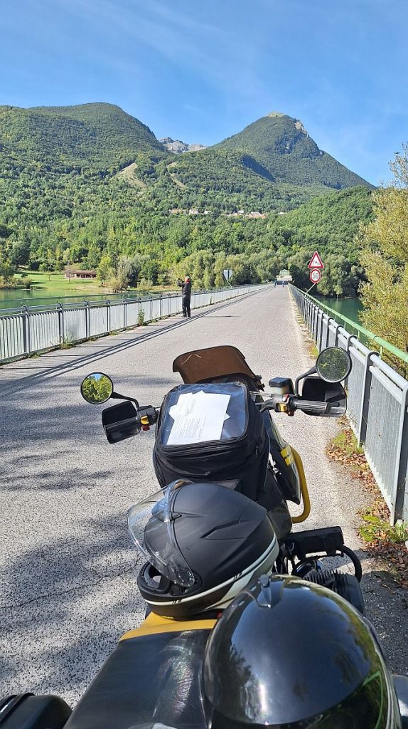 Und richtig viele Motorräder fahren bzw. stehen an Bars am Straßenrand. Auch Fahrräder und Touristen-Fahrzeuge aus Deutschland, Schweiz und Österreich. Hier kann man wohl recht gut unterkommen, das Städtchen Barrea sieht sehr schön aus. Über Serpentinen schlängeln wir uns in der Stadt hinunter zum See, um diesen dann nördlich zu umfahren. Wasser, wirklich viel Wasser, wir sind im Glück. Weiter westlich sehen wir eine große Brücke, die den See überquert. Ein Halt ist angesagt.