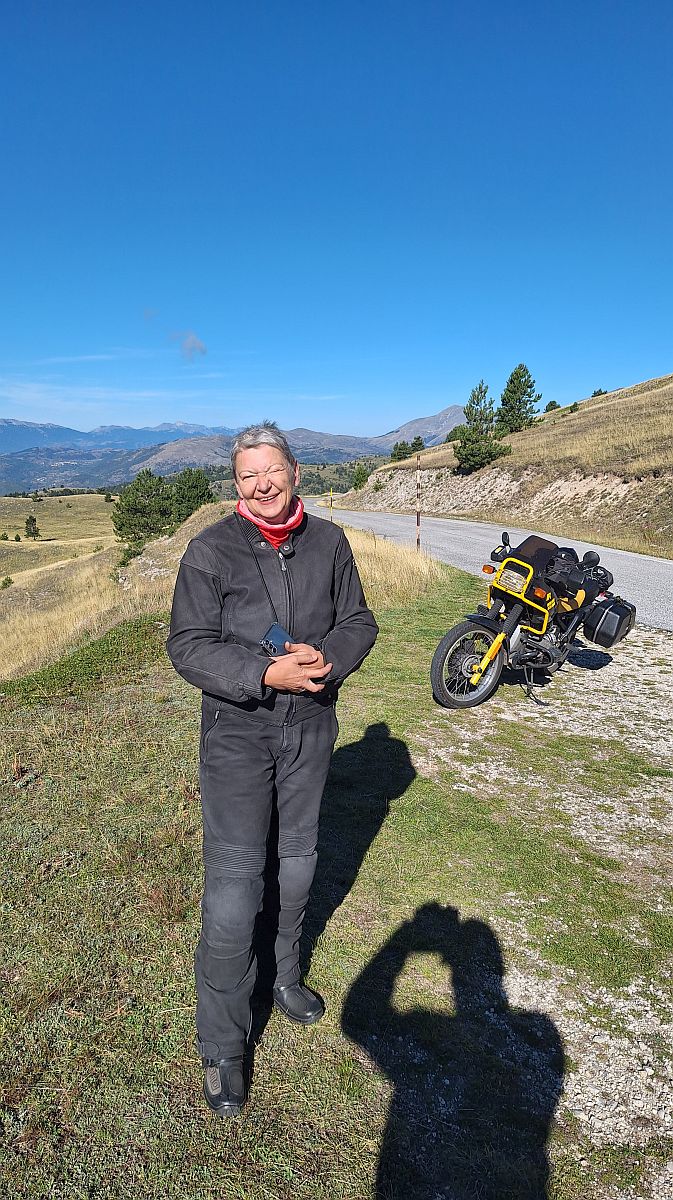 Dann kommen zwei Bücklinge des Weges hoch und drehen später um, denn nun stehen sie neben uns. OK, ich hatte zwei gesehen, es sind aber drei. Und wir werden als Esslinger angesprochen, d.h. irgendjemand aus unserer Ecke. Die dritte Fahrerin hat wohl unser Kennzeichen gesehen und den anderen beiden dies mitgeteilt, also nimmt man Kontakt zu uns auf. Es sind Göppinger, wir korrigieren Esslingen auf Filderstadt und man kommt ins Gespräch. Die drei sind seit 5 Tagen unterwegs und wollen noch weiter bis nach Sizilien, um von dort aus mit der Fähre zurückzufahren. Und sie sind am Tag davor in den dunklen Wolken oben auf dem Berg in den Regen gekommen. Die Wolken, die wir am Vortag bei einem Glas Wein von weitem gesehen hatten.